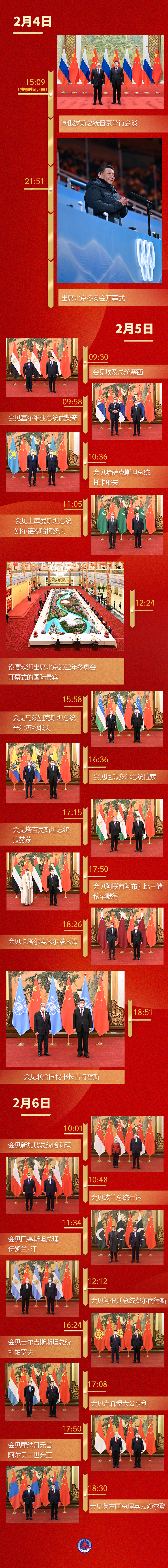 当人们共赏精彩激烈的北京冬奥会时,习近平主席开启了高强度、快节奏的外事日程。这也成为新冠肺炎疫情发生后,两年多来在华举行的最大规模的主场活动,向世界传递着中国同各国团结合作、“一起向未来”的强烈信号。